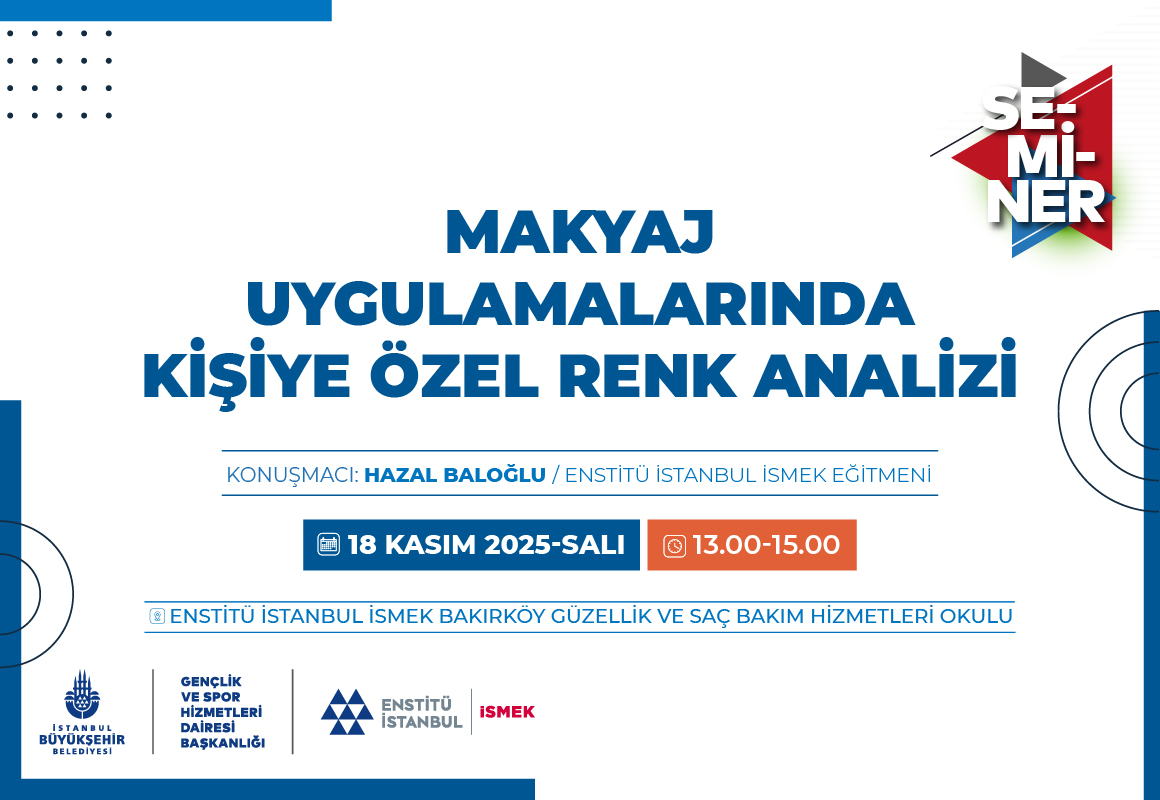 Enstitü İstanbul İSMEK’in, Kasım ayı okul seminerleri, “Makyaj Uygulamalarında Kişiye Özel Renk Analizi” konulu seminerle devam ediyor. Enstitü İstanbul İSMEK eğitmenlerinden Hazal Baloğlu’nun katılımıyla, Bakırköy Güzellik ve Saç Bakım Hizmetleri Okulu’nda gerçekleşecek seminerde, “Renk Teorisine Giriş”, “Cilt Alt Tonu Belirleme”, “Mevsimsel Renk Analizi” konuları ele alınacak. Katılımcılar, seminerde renk teorisinin temellerinden başlayarak kendi cilt alt tonlarını belirlemeyi, mevsimsel renk analizi yöntemleriyle kendilerine en uygun renk paletini seçmeyi ve renk psikolojisini kişisel ifade biçimlerinde etkili bir şekilde kullanmayı öğrenecek. Seminere tüm İstanbullular davetlidir.