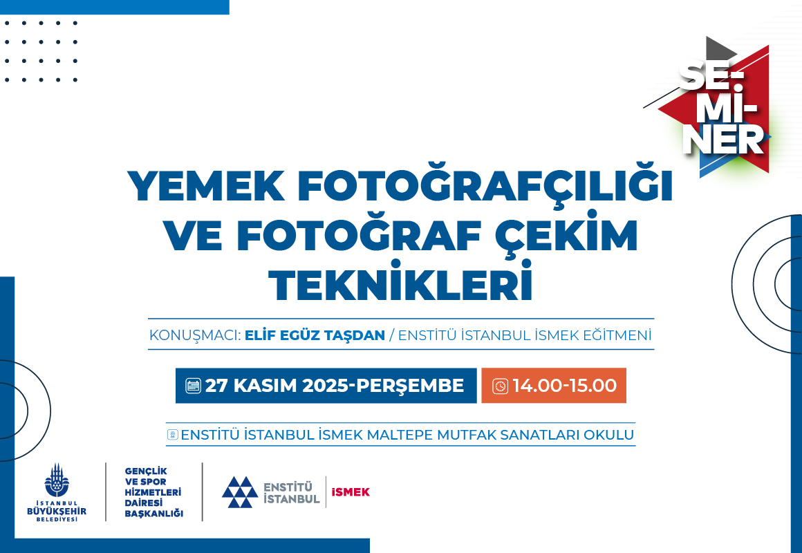 Enstitü İstanbul İSMEK, fotoğrafçılığa ilgi duyanlar için kaçırılmayacak bir seminer düzenliyor. Kasım ayı okul etkinlikleri kapsamında, “Yemek Fotoğrafçılığı ve Fotoğraf Çekim Teknikleri” başlığı altında düzenlenecek seminer, Elif Egüz Taşdan’ın katılımıyla Maltepe Mutfak Sanatları Okulu’nda gerçekleşecek. “Yemek Fotoğrafçılığının Temelleri”, “Yemeğin Doğru Işıkla Tanıtılması”, “Kompozisyon ve Perspektif”, “Arka Plan ve Prop Kullanımı”, “Yemeğin Hazırlanışı ve Sunumu”, iç mekânda yemek fotoğrafı çekerken nelere dikkat edilmesi gerektiği konusunda değerli bilgilerin paylaşılacağı seminerin konu başlıklarını oluşturuyor. Seminere tüm İstanbullular davetlidir.