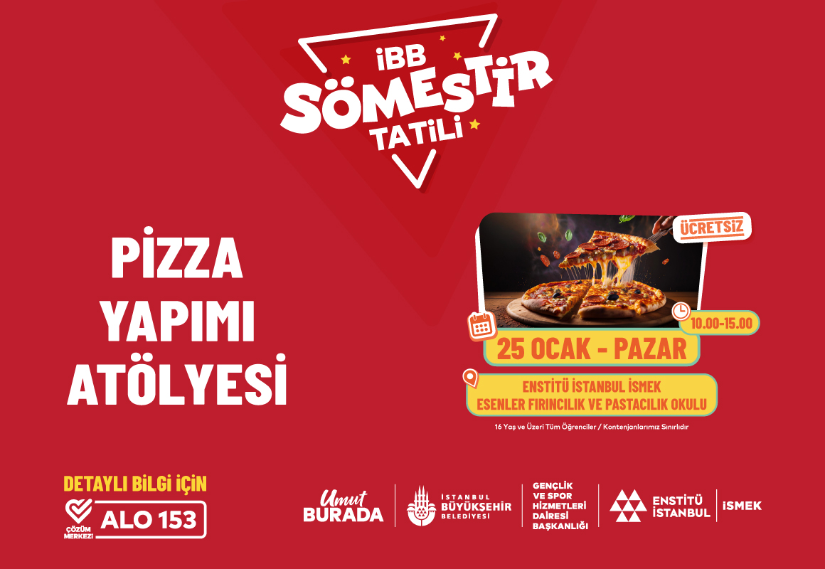 Enstitü İstanbul İSMEK, İBB’nin yarıyıl tatiline özel düzenlediği sömestir etkinlikleri kapsamında “Pizza Yapımı Atölyesi” düzenliyor. Eğitmen Tuğba Kaplan’ın rehberliğinde gerçekleşecek atölye ile katılımcılara; temel hamur hazırlama, malzeme seçimi ve pişirme teknikleri öğretilerek kendi pizzalarını yapabilme becerisi kazanmaları amaçlanıyor. Sınırlı kontenjana sahip etkinliğe katılmak için yerinizi ayırtmayı unutmayın!